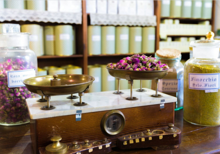 Fin dall'inizio fu fatta la scelta fondamentale che caratterizza il negozio anche oggi: l'uso e la presentazione delle erbe medicinali e dei loro più semplici derivati.